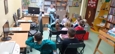 Dzieci z grupy 5-6latków wysłuchały w szkolnej bibliotece bajki terapeutycznej "Razem łatwiej i przyjemniej".
