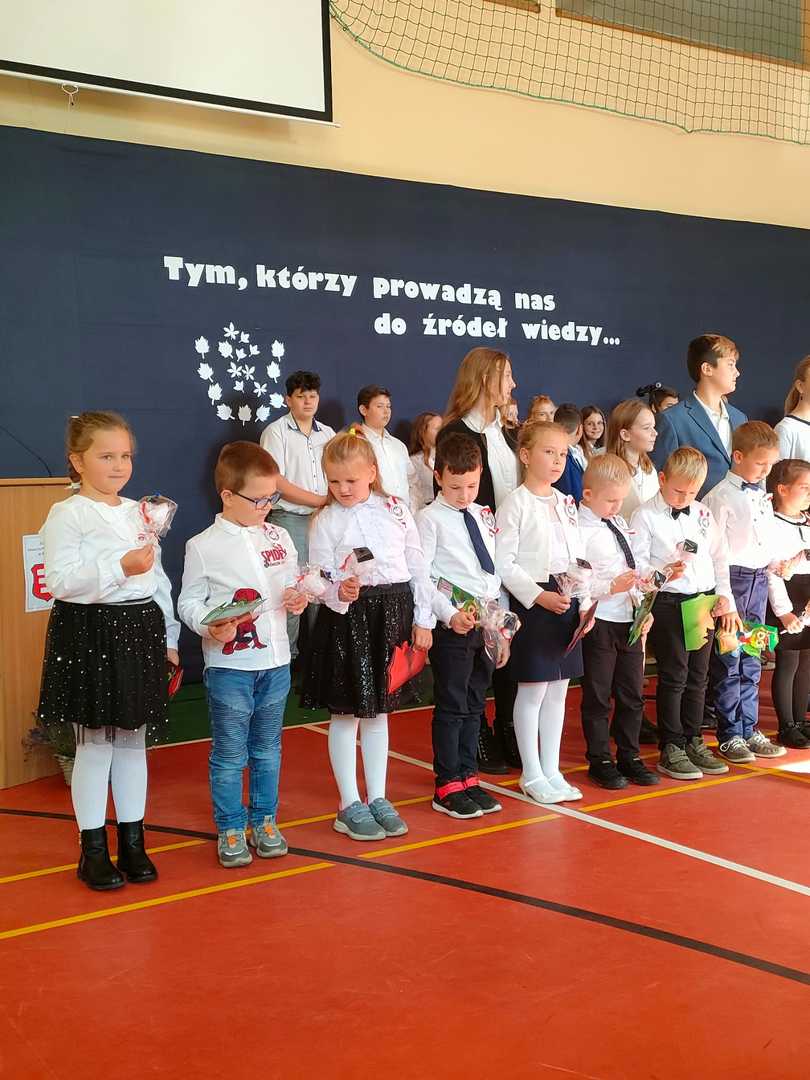 Dnia 13.10.2022 r. w naszej szkole odbyła się akademia z okazji Dnia Edukacji Narodowej oraz pasowanie na Pierwszoklasistów. Uroczystość rozpoczęła się od przemówienia Pana Dyrektora Piotra Kowalskiego, który przywitał wszystkich nauczycieli, pracowników szkoły oraz zaproszonych gości. W swoim przemówieniu nawiązał do trudnej, ale jakże pięknej pracy nauczyciela. Podziękował za dotychczasowe zaangażowanie oraz życzył wielu sił i wytrwałości w tym wyjątkowym zawodzie. Następnie przekazał głos zastępcy Wójta Gminy Panu Tomaszowi Gałanowi, który zapewnił, że dla strzałkowskiego Samorządu edukacja jest jednym z priorytetów i mimo trudnej sytuacji ekonomicznej w całym kraju, na kształceniu i wychowaniu dzieci nie należy oszczędzać. Złożył również życzenia nauczycielom, a uczniom klasy pierwszej życzył dużo radości z codziennej podróży w cudowny świat nauki oraz wielu przyjaciół. Młodzi artyści klasy 8b oraz 5a piosenką i słowem uświetnili ten wyjątkowy dzień w roku szkolnym. Wiele ciepłych i miłych słów popłynęło w kierunku naszych nauczycieli. Uczniowie docenili i podkreślili swoją wdzięczność za codzienny trud pracy nauczyciela, jego poświęcenie, czujność i troskę o dobro wychowanków. Po zakończonej akademii zaproszeni goście wraz ze społecznością szkolną udali się na poczęstunek.