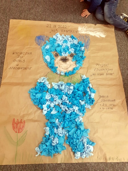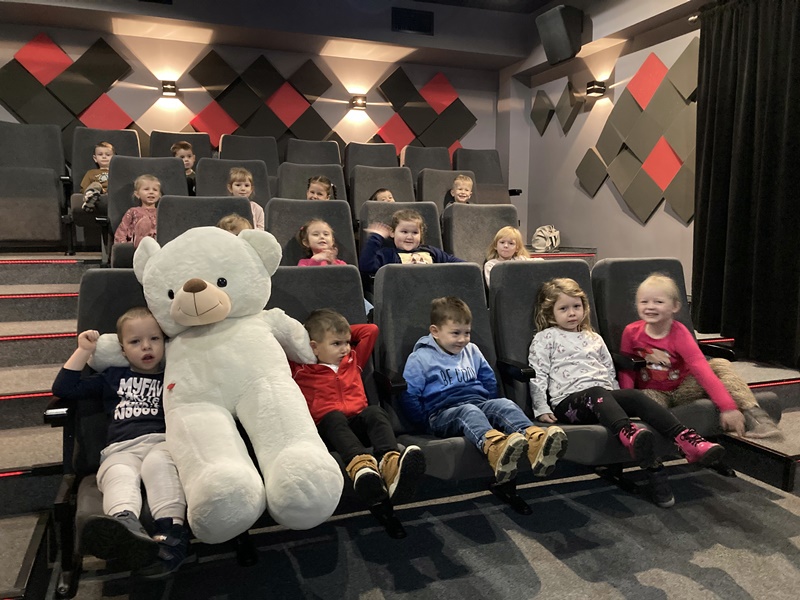 Podczas wyjazdu dzieci obejrzały w Kinie za Rogiem bajkę ,,Miś Fantazy’’ oraz przygotowały pracę plastyczną, której bohaterem był miś. Nie zabrakło urodzinowego tortu i wspólnie odśpiewanego ,,Happy Birthday’’. Przedszkolaki wraz z rodzicami przygotowały dla misia prezent- prace plastyczne, które przedstawiały właśnie misia.