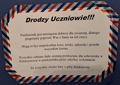 Szkolne koło wolontariatu serdecznie zaprasza do pomocy naszym kochanym zwierzakom. Zbliża się okres zimowy-nie zapominajmy o naszych milusińskich.