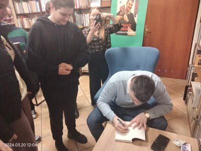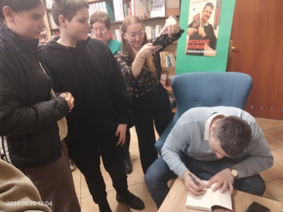 Podczas spotkania uczniowie poznali genezę powstania pierwszej części książki pt. „Gimbaza”, dowiedzieli się, że druga część książki jest już napisana i czeka na wydanie oraz że powstaną kolejne jej części. Nasi uczniowie mieli możliwość zadawania pytań autorowi i bezpośredniej rozmowy z nim. Na koniec spotkania ustawiła się długa kolejka uczniów, którzy nabywali książkę, a autor każdemu z nich składał dedykację.