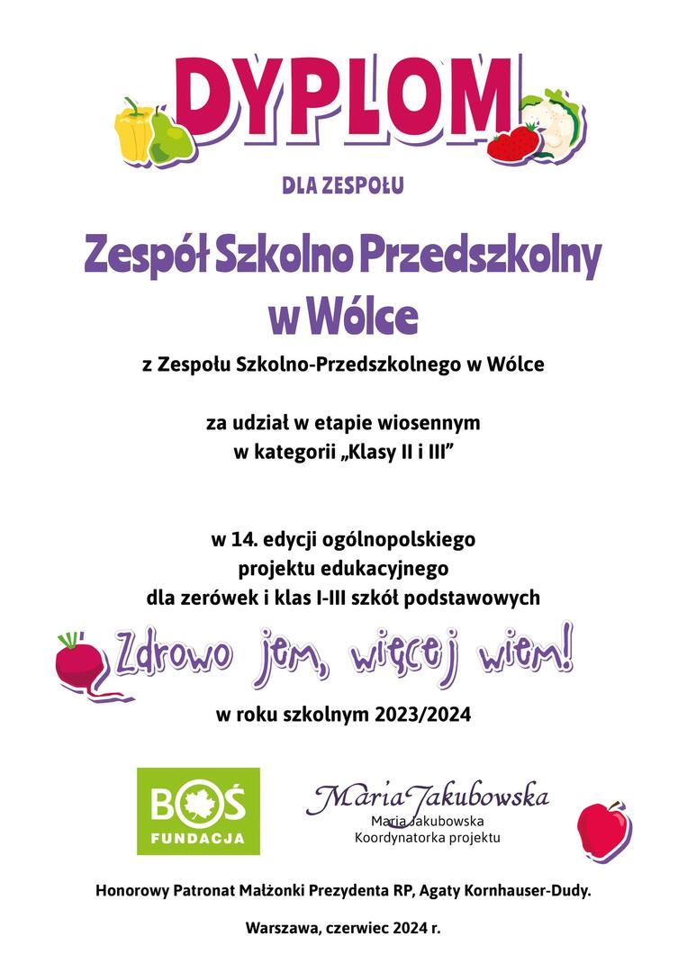 W miesiącu marcu i kwietniu klasa druga brała udział w Ogólnopolskim projekcie "Zdrowo jem , więcej wiem". Głównym celem projektu było wykształcenie u dzieci postaw prozdrowotnych poprzez uczenie zasad zdrowego odżywiania oraz przekazywanie wiedzy na temat produktów służących zdrowiu i produktów dla zdrowia szkodliwych.Ważnym celem było również uświadomienie związku pomiędzy żywieniem, a występowaniem wielu chorób i dolegliwości oraz podkreślenie roli codziennej aktywności fizycznej w profilaktyce zdrowotnej. Przez sześć tygodni uczniowie brali udział w lekcjach tematycznych. Dziś poznaliśmy wyniki tego projektu. Klasa druga zajeła wysokie 61 miejsce przy ogólnej liczbie 248 uczestników. Serdecznie gratulujemy!