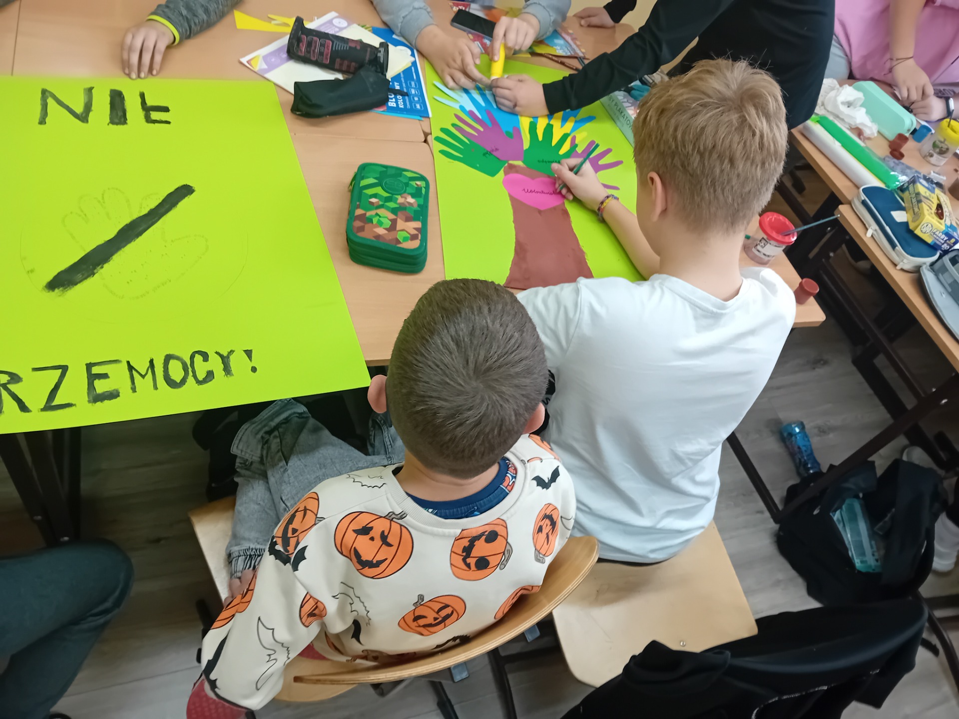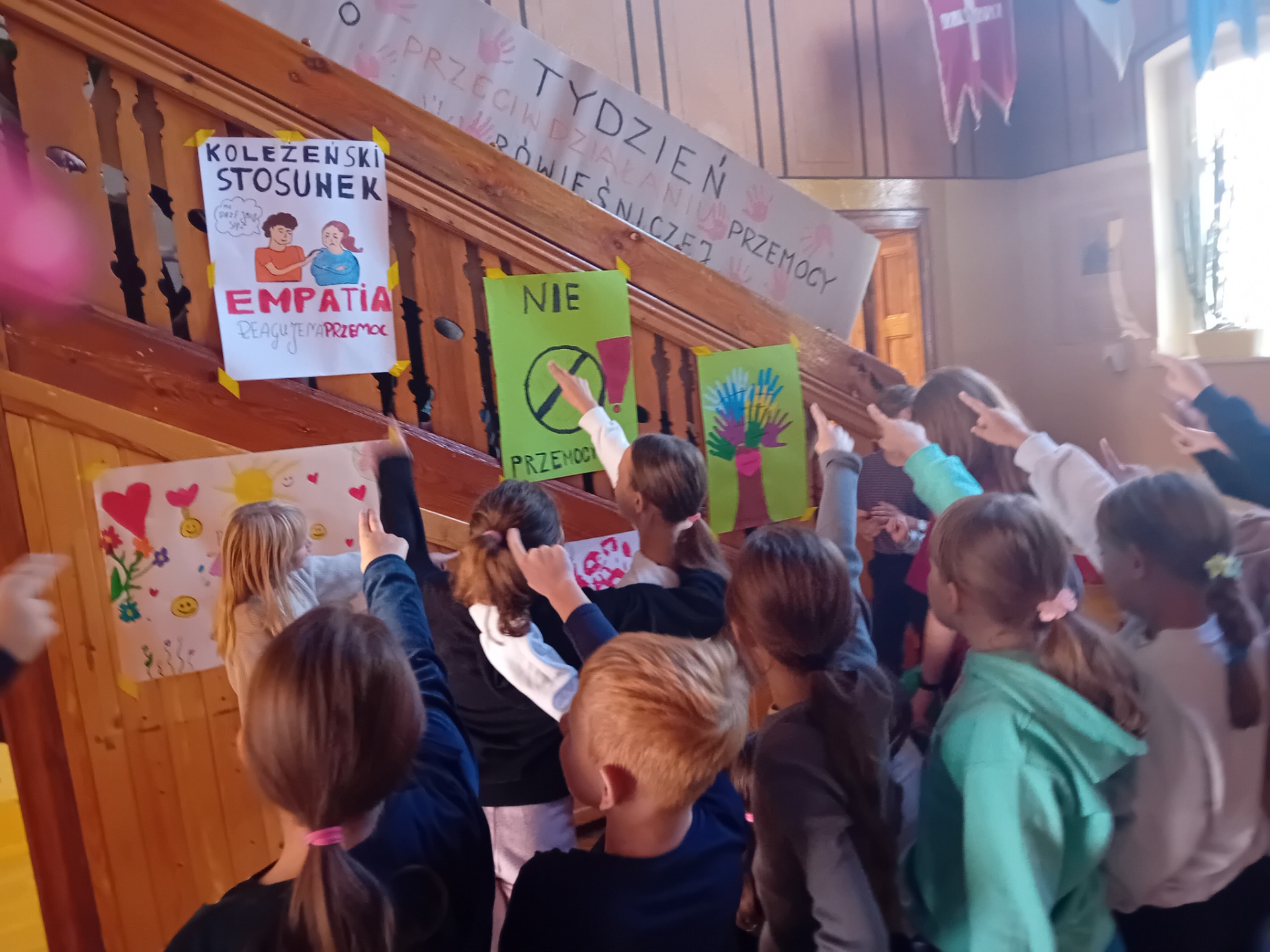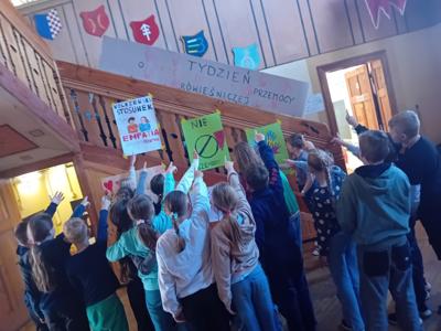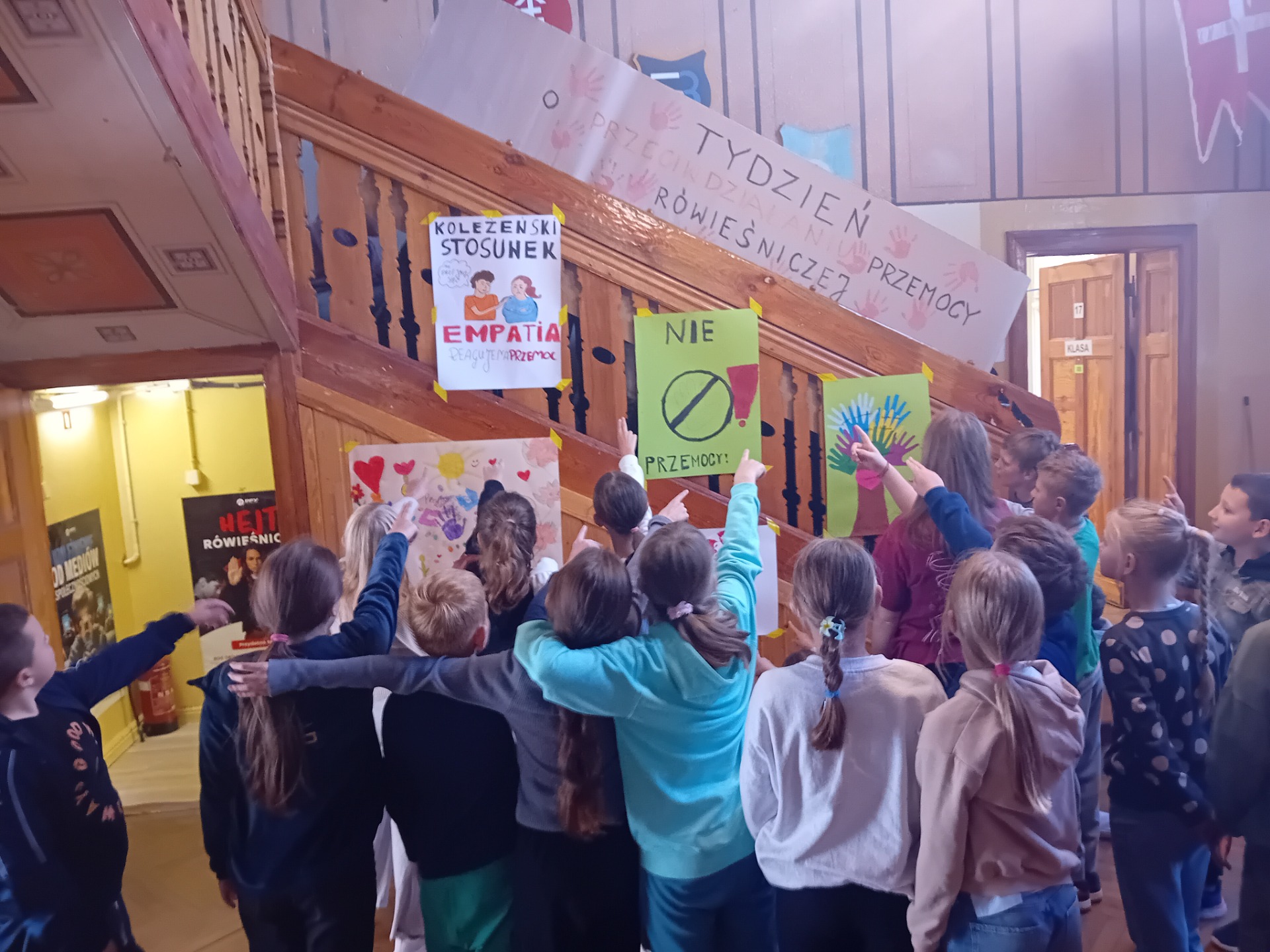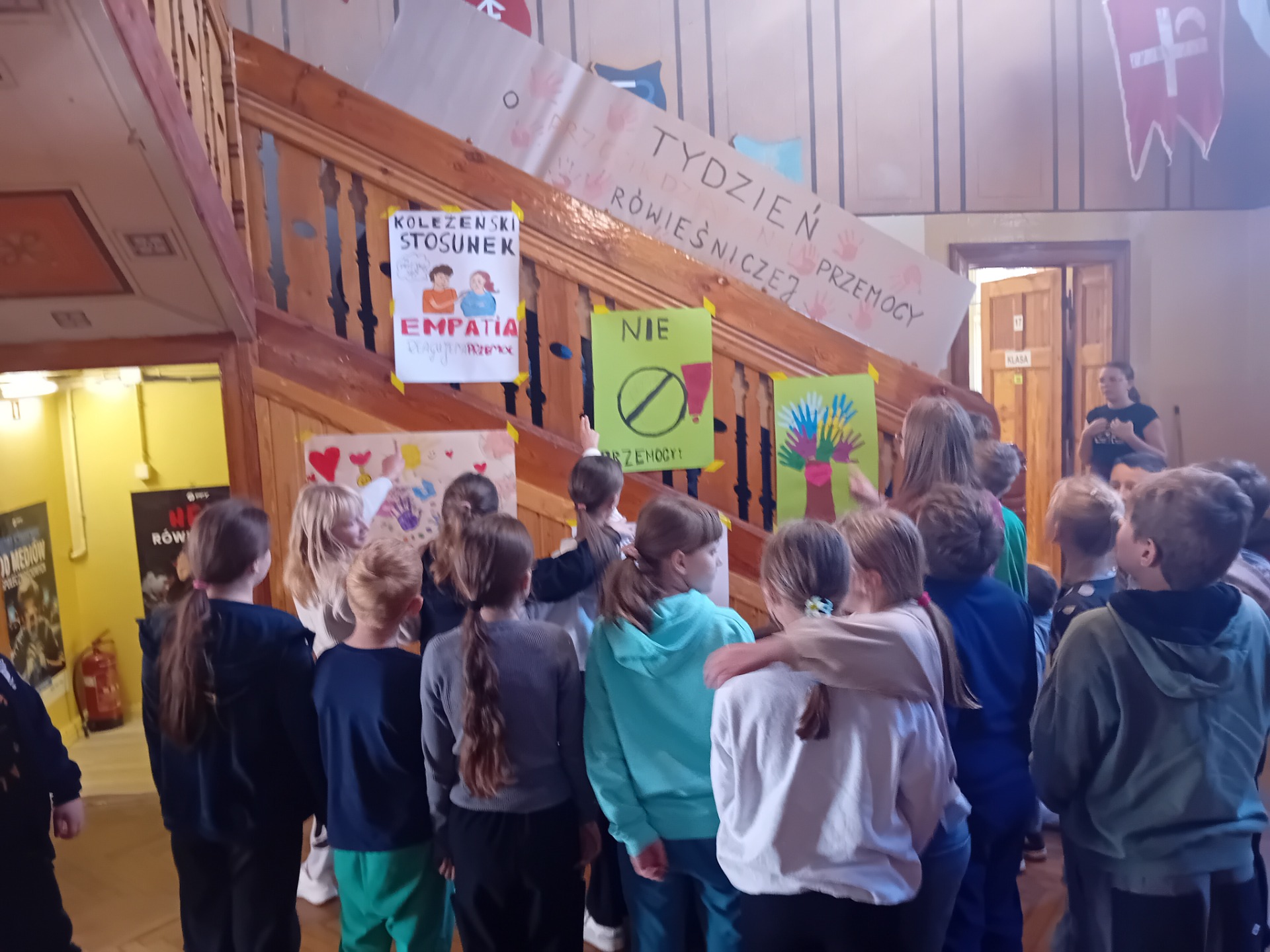 Samorząd Uczniowski aktywnie włączył się do akcji i na terenie szkoły został przeprowadzony konkurs na plakat promującej empatię, szacunek i koleżeństwo. Dzieci przy współpracy z nauczycielami świetlicy i opiekunem samorządu wykonały plakaty, które następnie zostały wyeksponowane na małym holu. Na szczególne wyróżnienie zasłużyły kl.5 i 6. Do aktywności włączyły się również uczniowie kl.3 i 8b. Gratulujemy, wyszło wspaniale.